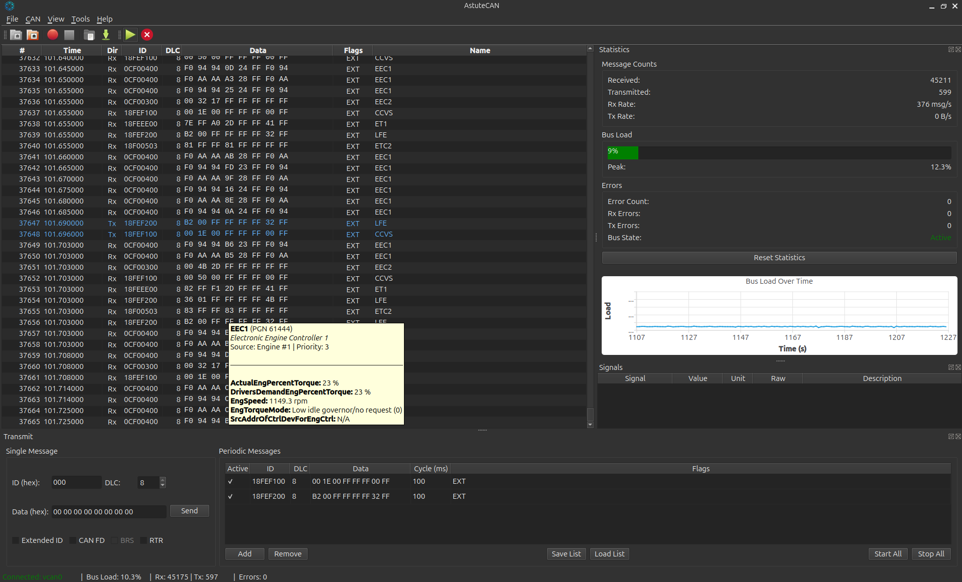 AstuteCAN includes built-in protocol databases for automatic message decoding across 14 industry-standard protocols: